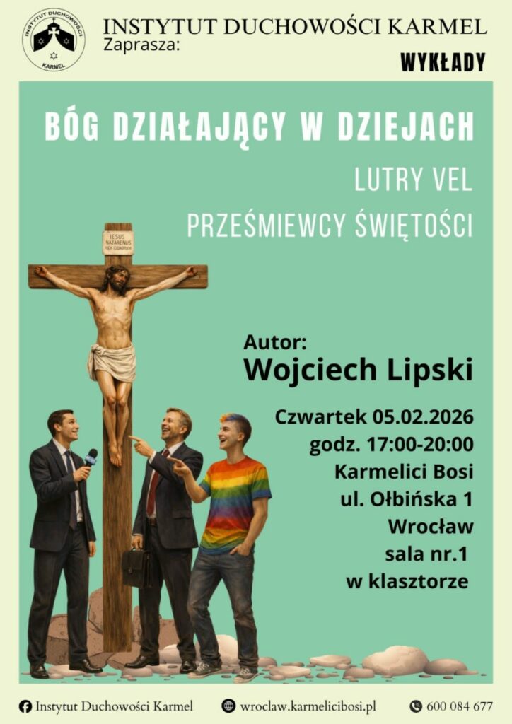 W czwartek, 05.02.2026, odbędzie się kolejny wykład z cyklu „Bóg działający w dziejach”, który poprowadzi dla nas Wojciech Lipski. Tematem wykładu będzie: „Lutry vel prześmiewcy świętości”.